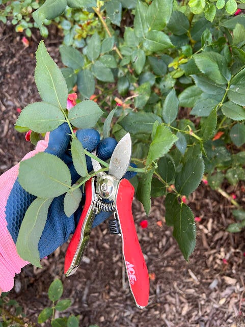 Check your rose bushes once or twice a week throughout the summer. Roses bloom in cycles, so the more you deadhead, the more you’ll encourage repeat blooms. I do this whenever I weed since I have my supplies out anyway.